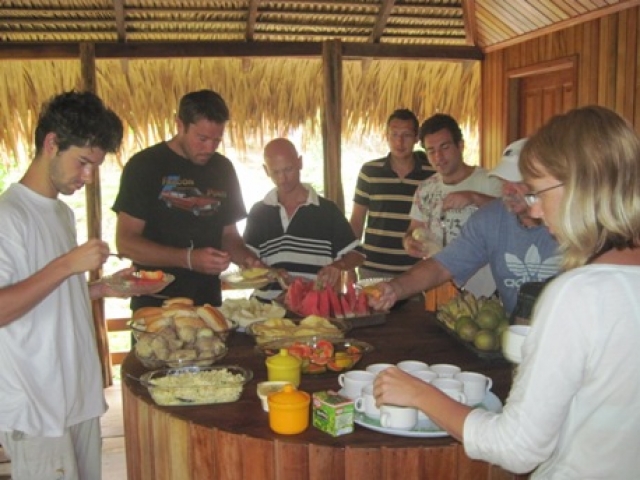 Almoço. Depois de descansar um pouco sairemos para acampar na selva dormindo em redes. Na selva, construiremos um acampamento com folhas de palmeira e gravetos da selva. Passar a noite na selva é uma experiência única que jamais esqueceremos em nossas vidas, ouvindo os sons que nunca ouvimos em nossas vidas. O jantar na selva será arroz, frutas, peixe ou carne ou frango assado em uma fogueira.